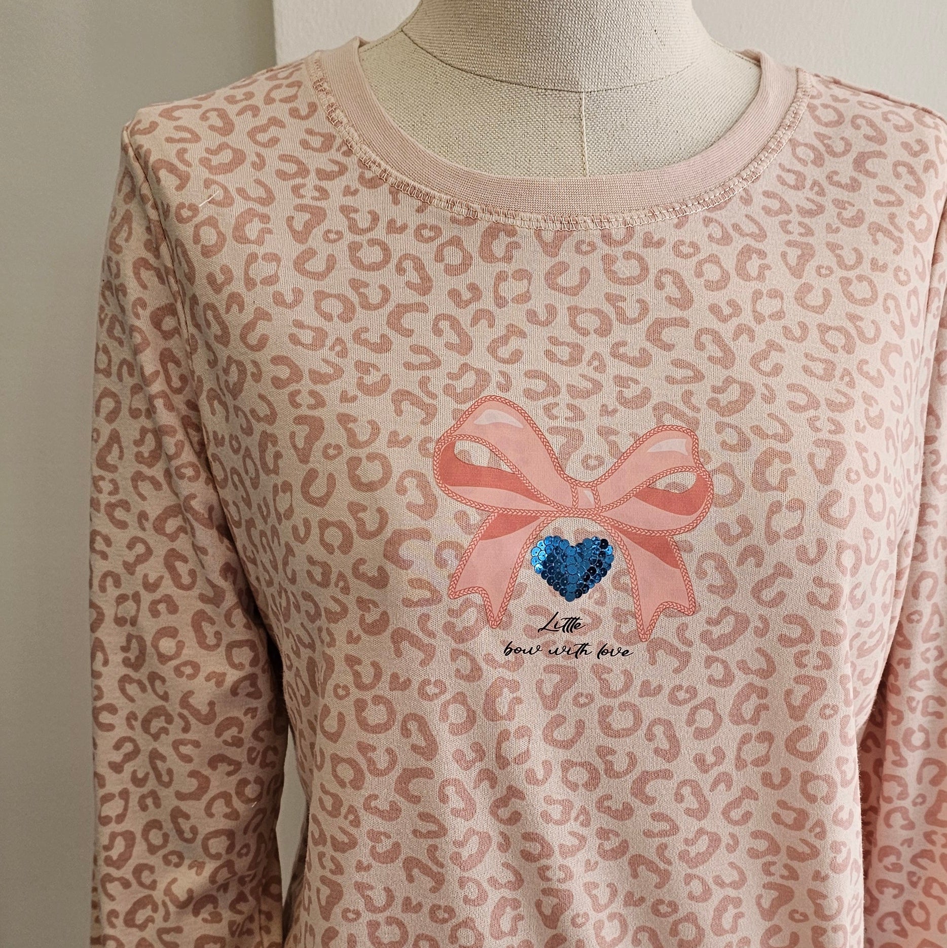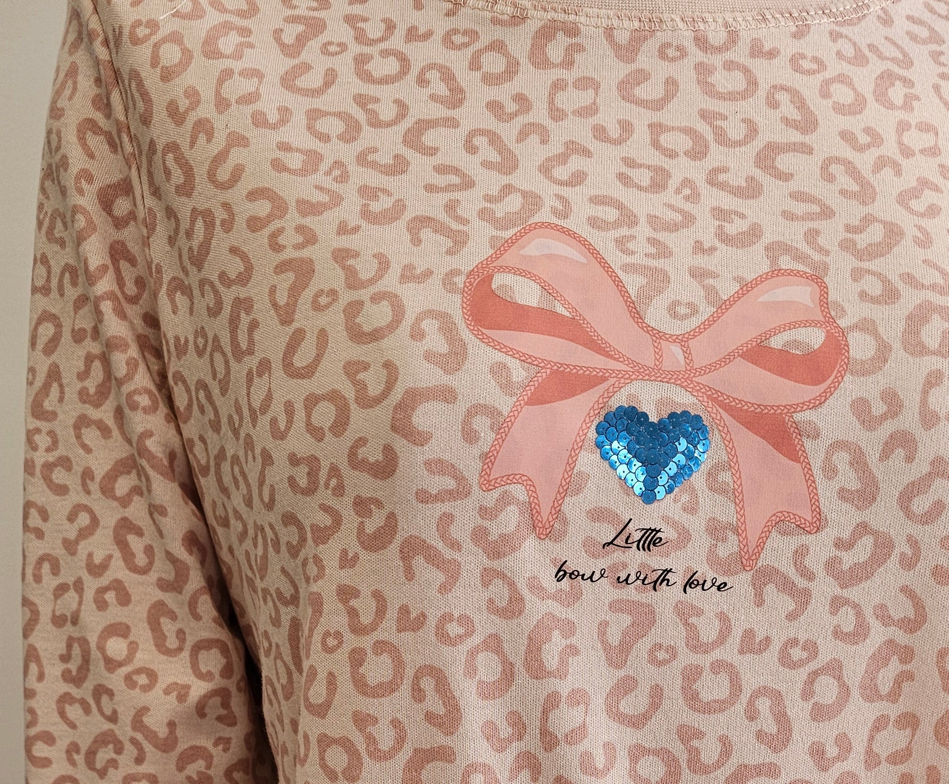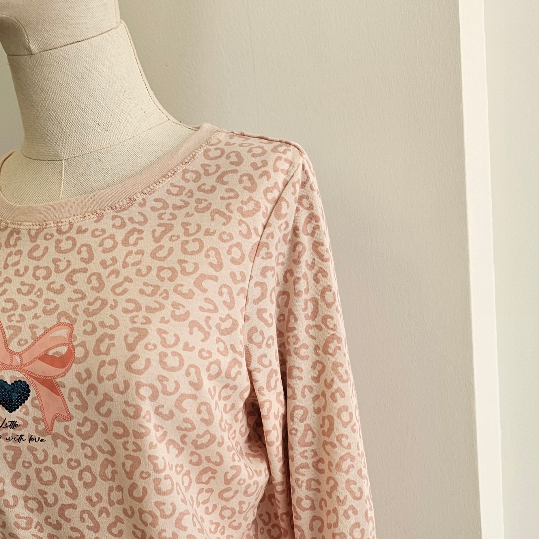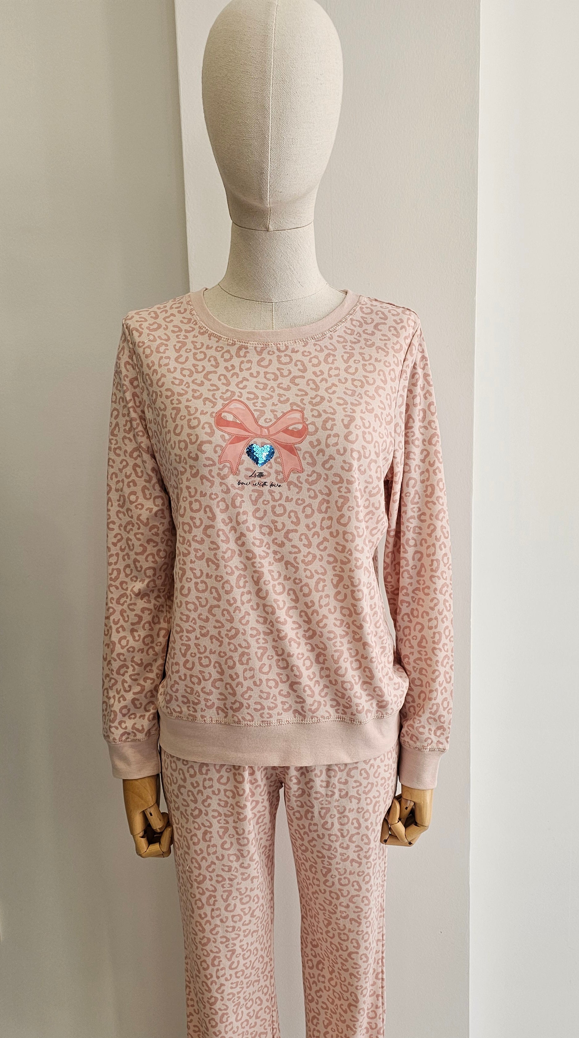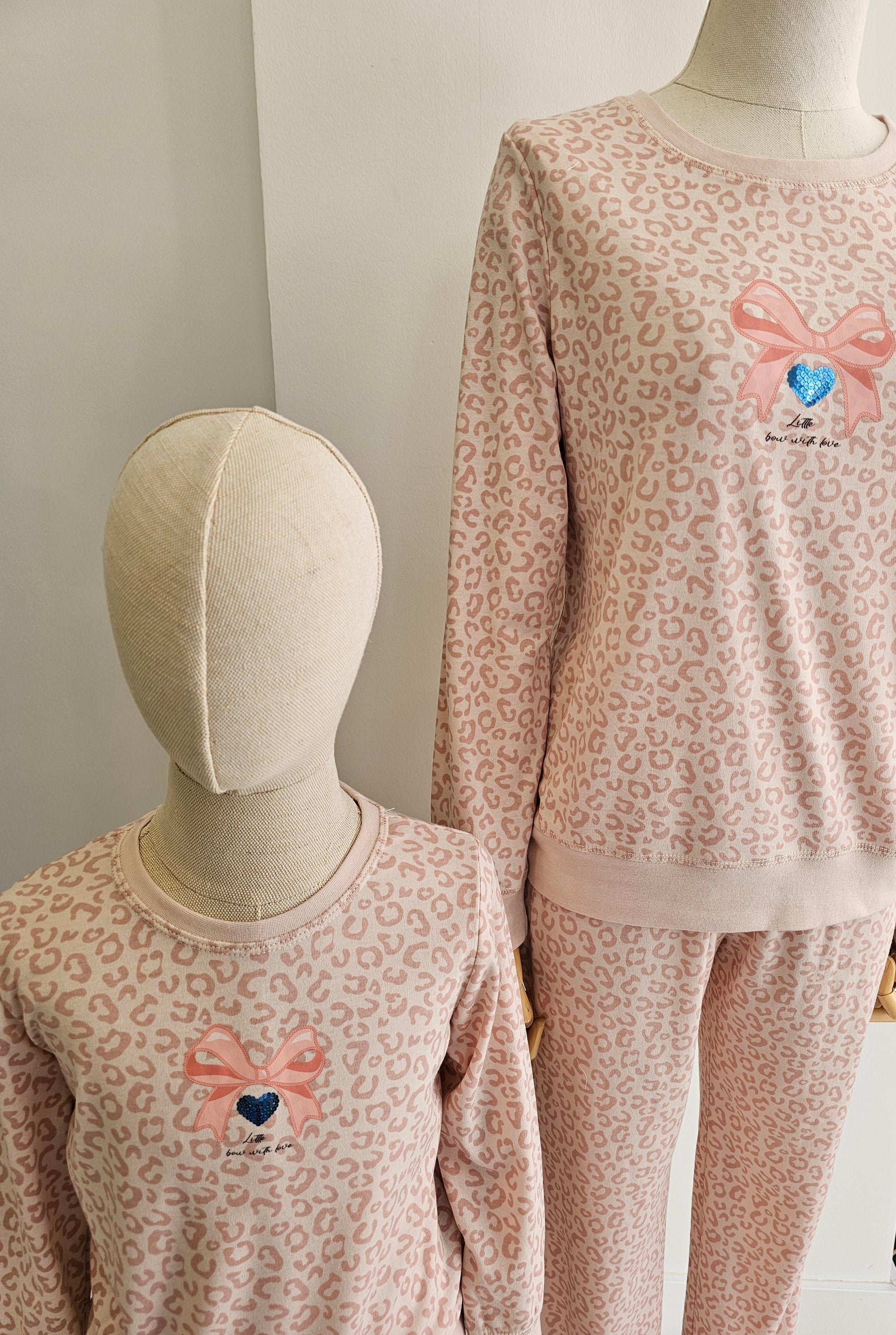 Conjunto de pijama diseñado para madre e hija, presentando un sutil motivo animal print en rosa pastel. La composición de algodón 90% y poliéster 10% garantiza transpirabilidad y resistencia al lavado frecuente. Destaca por su adorno de lentejuelas en forma de corazón, que aporta elegancia al diseño. Esta propuesta permite coordinar el look entre ambas generaciones de manera armónica. También disponible en beige. Una selección acertada para obsequiar en ocasiones especiales.