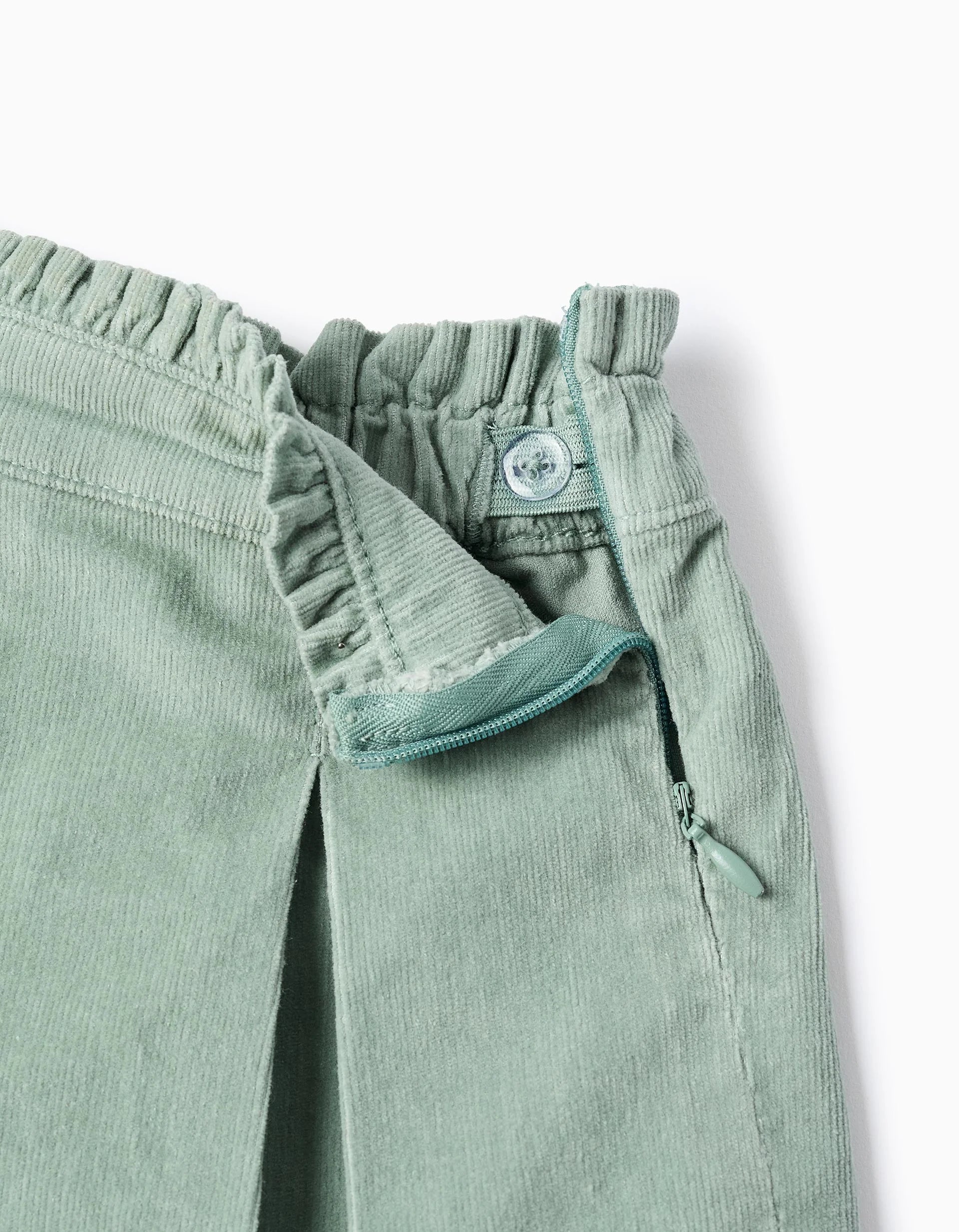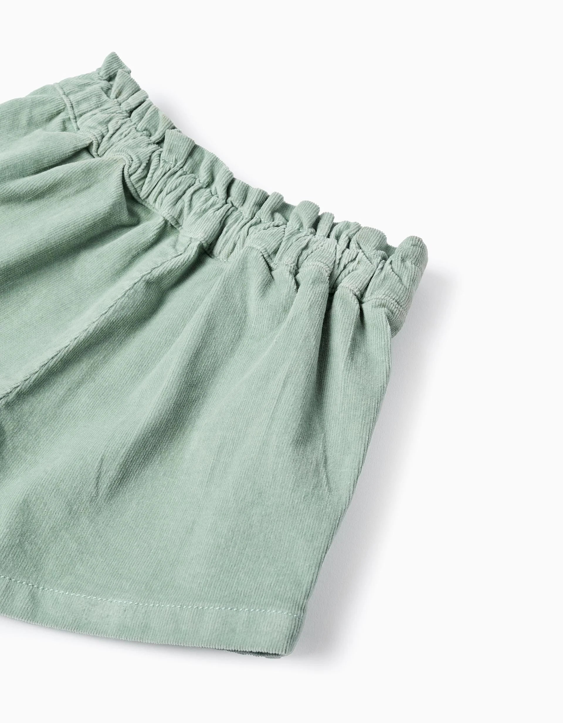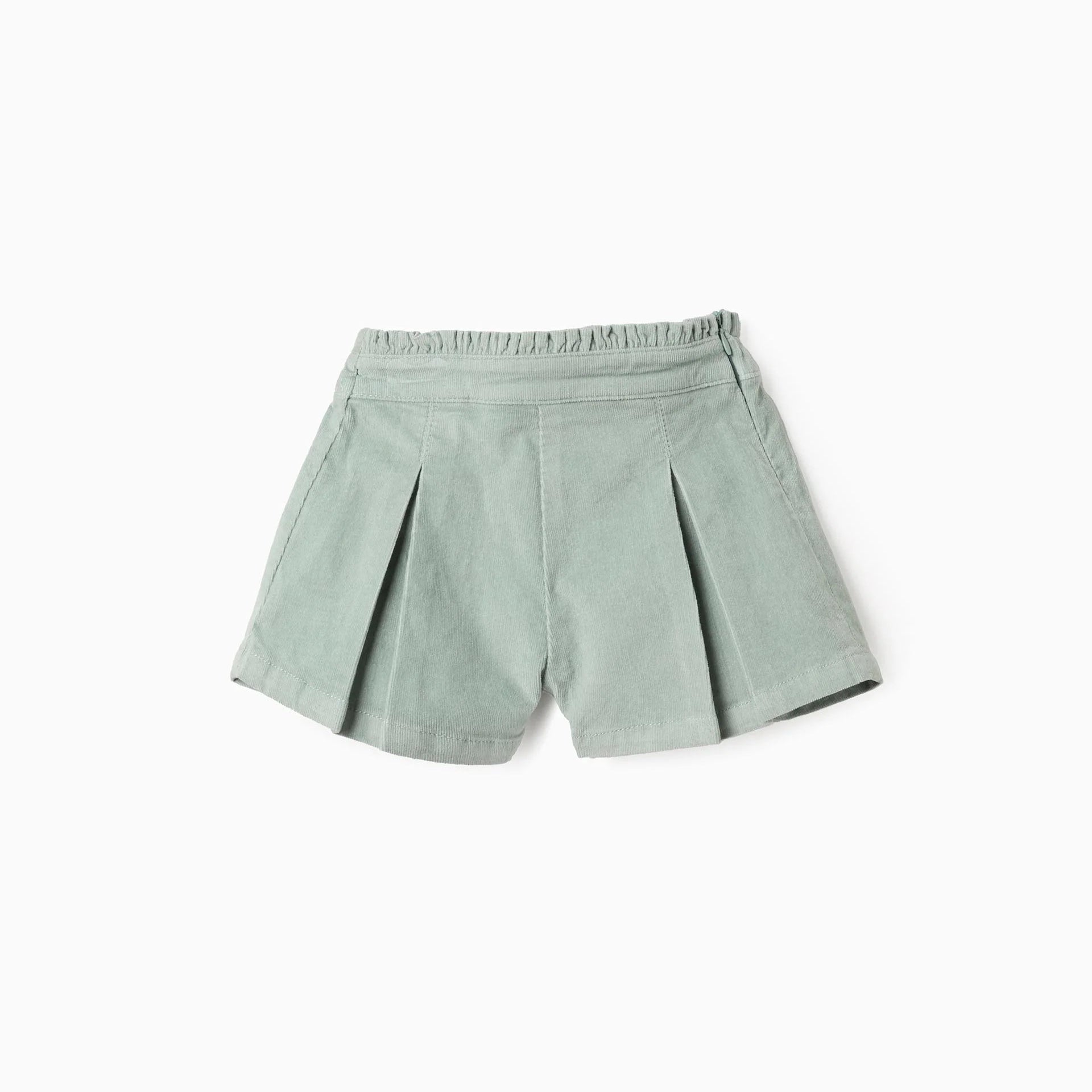 Pantalones cortos plisado verde agua para bebé niña, de pana de algodón con un toque de elástico para mayor comodidad y libertad de movimientos. Cintura con volantes, elástica detrás y ajustable en el interior con elásticos y botones. Cierre de cremallera lateral para vestirla fácilmente. Para looks de otoño-invierno llenos de color y siempre a la moda.