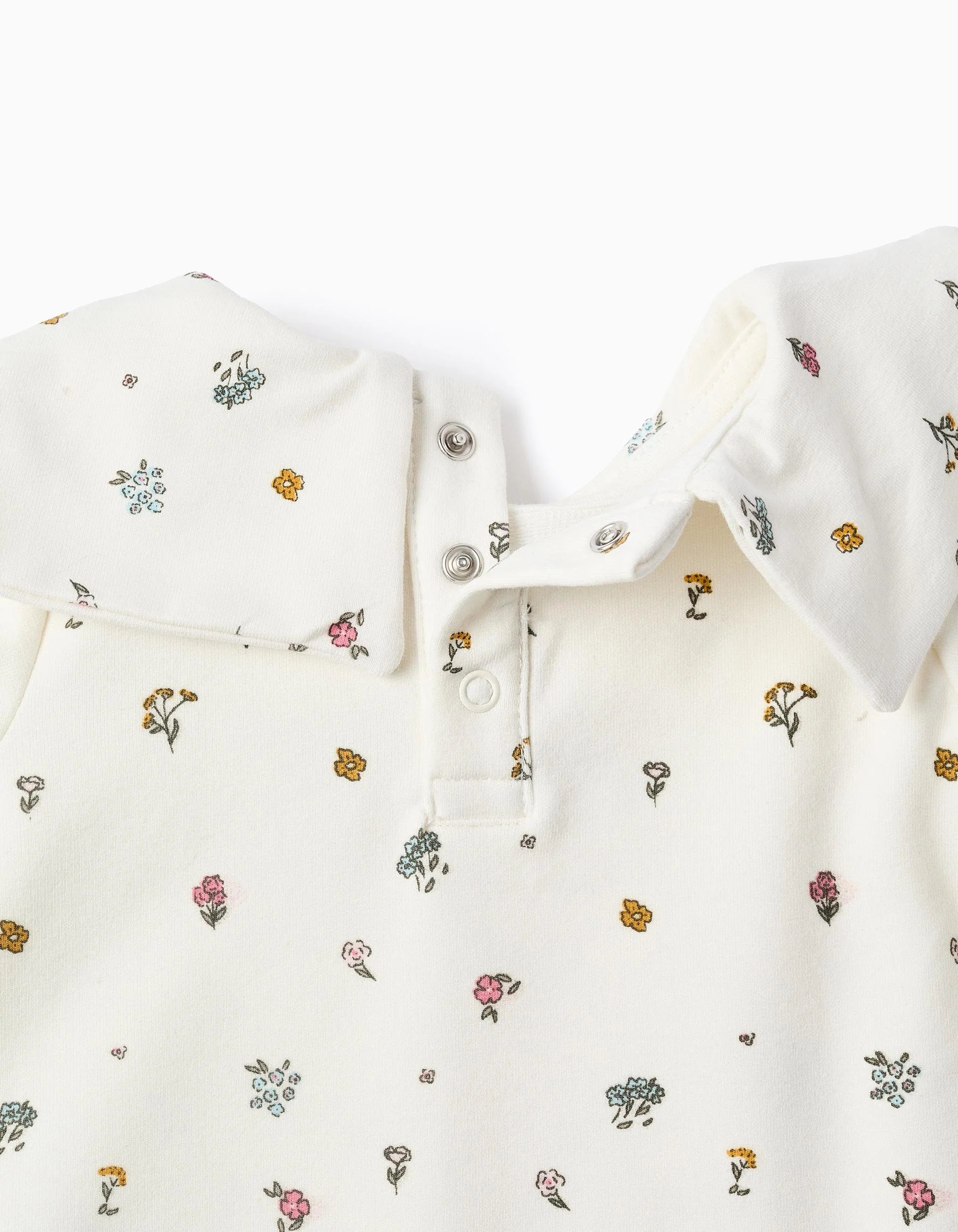 Sudadera blanca para recién nacidos, 100 % algodón. Motivo floral y maxi lazo en la parte delantera. Cierres a presión en la espalda para vestirlo fácilmente.