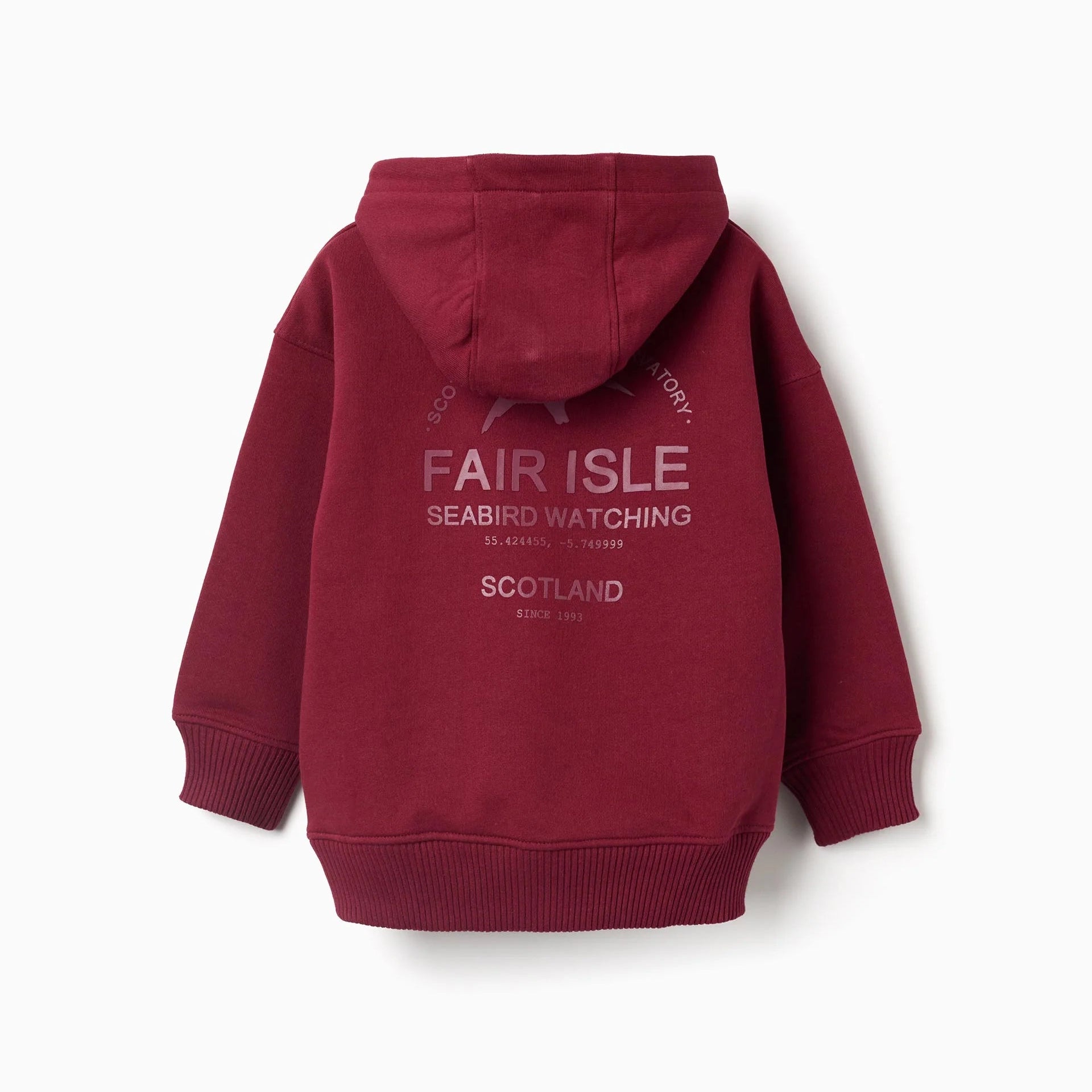 Sudadera roja oscura para niño, 100 % algodón. Con interior perchado para mayor confort térmico. Capucha con ribete acanalado y forro en jersey. Con bordado en el pecho y estampado en relieve en la espalda. Puños y bajo acanalados para un ajuste perfecto. ¡La sudadera ideal para el día a día!