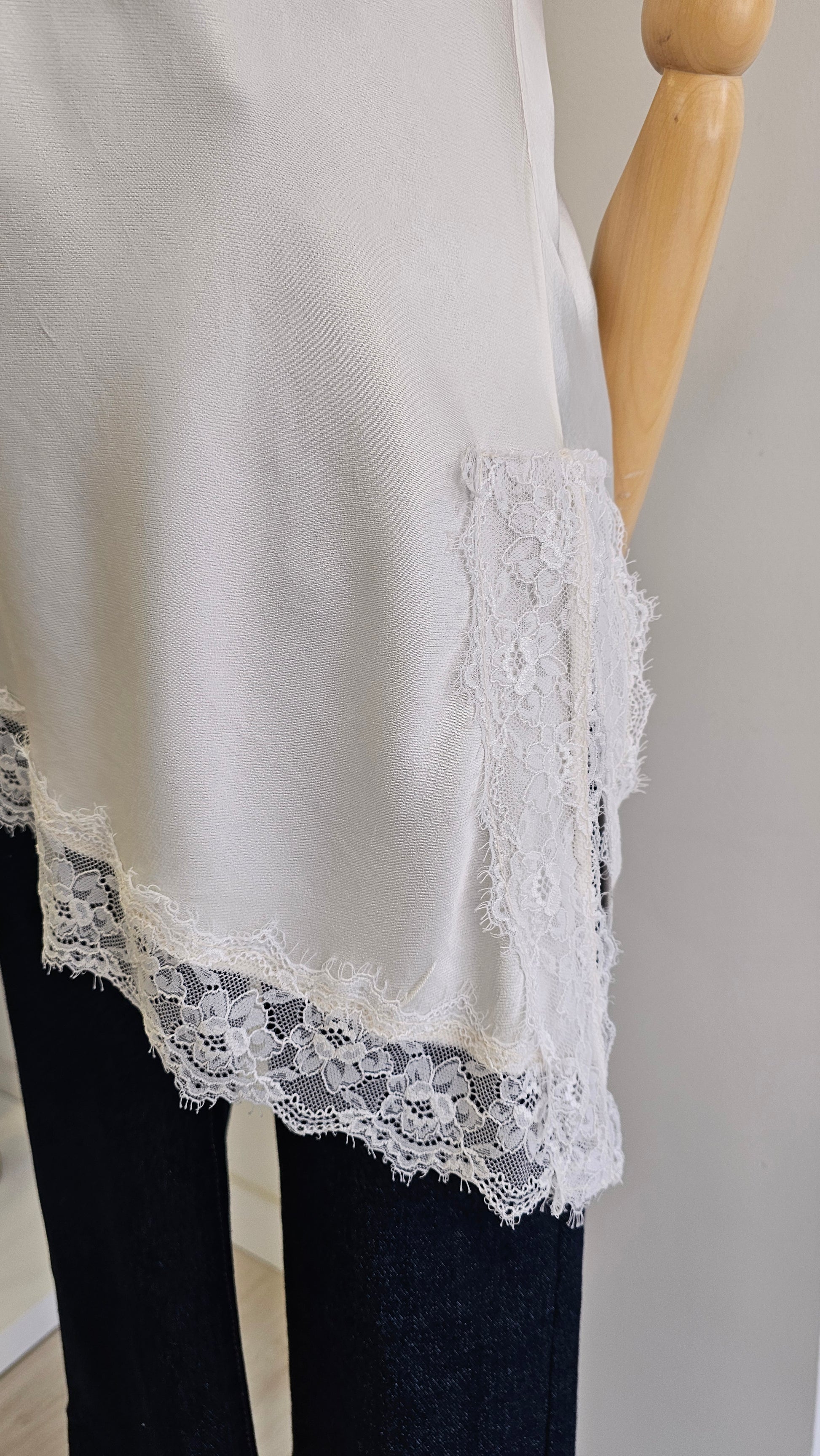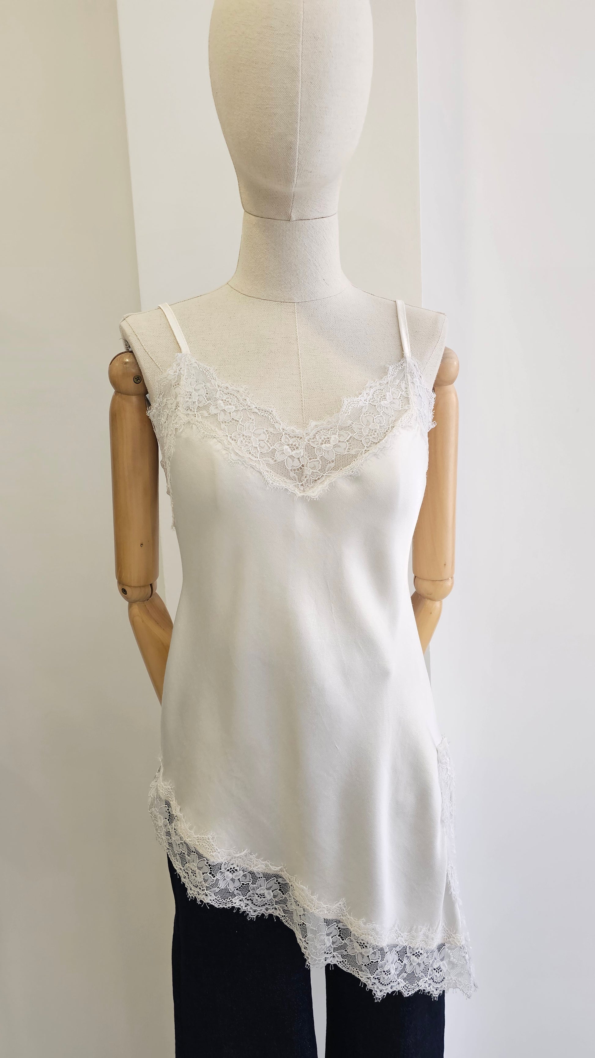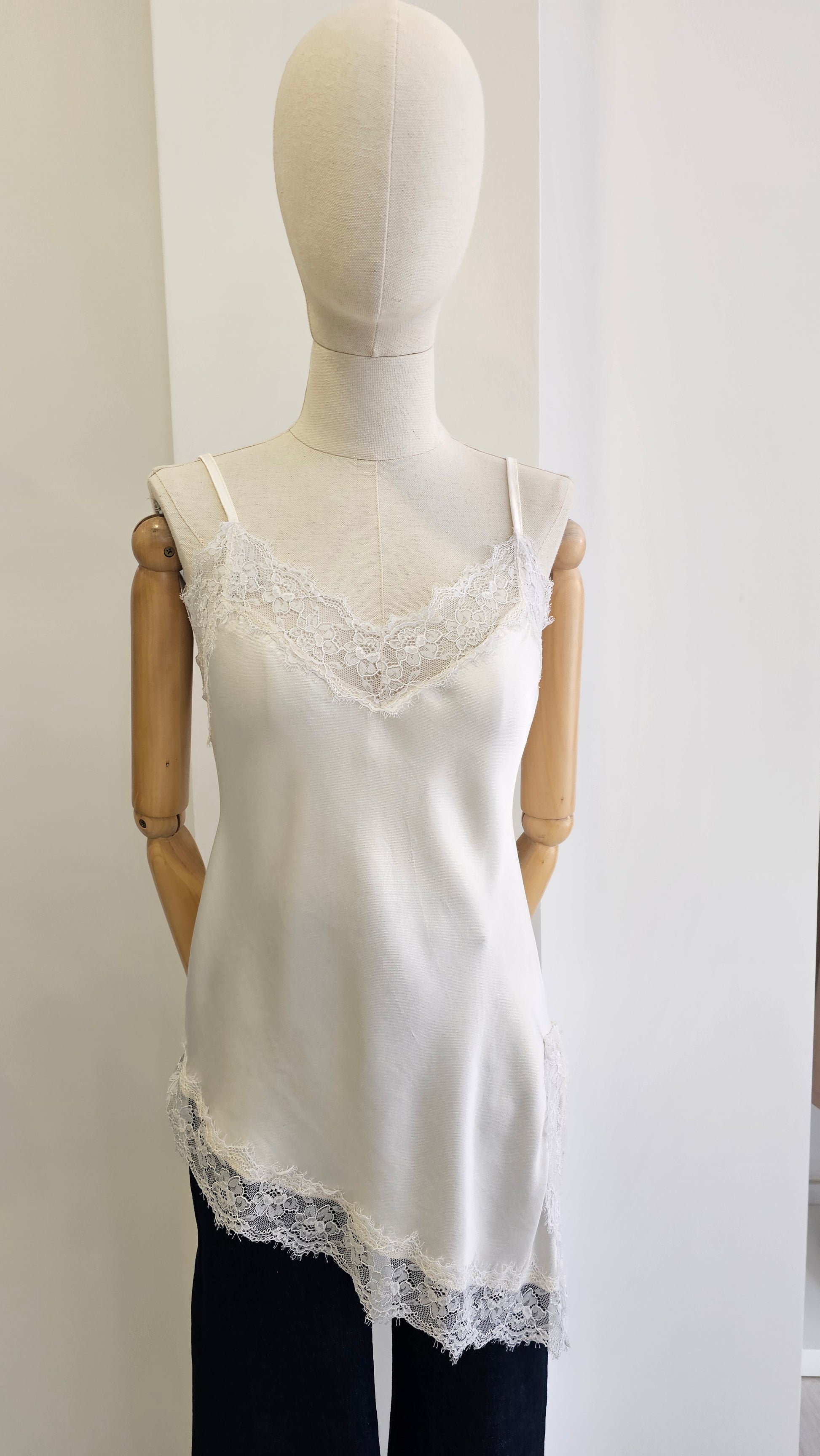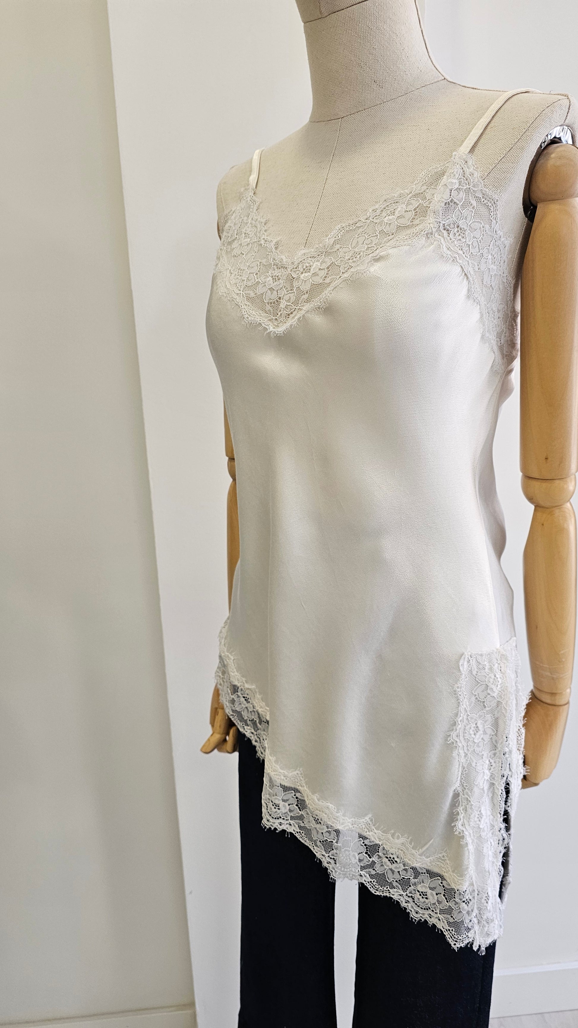 Talla única que abarca desde XS hasta M. Confeccionado en un tejido de calidad superior y caída impecable. Perfecto para combinar con un jersey corto y escotado que deje visible el delicado encaje y el diseño asimétrico con corte en pico en un solo lateral. Disponible en colores blanco y marrón.