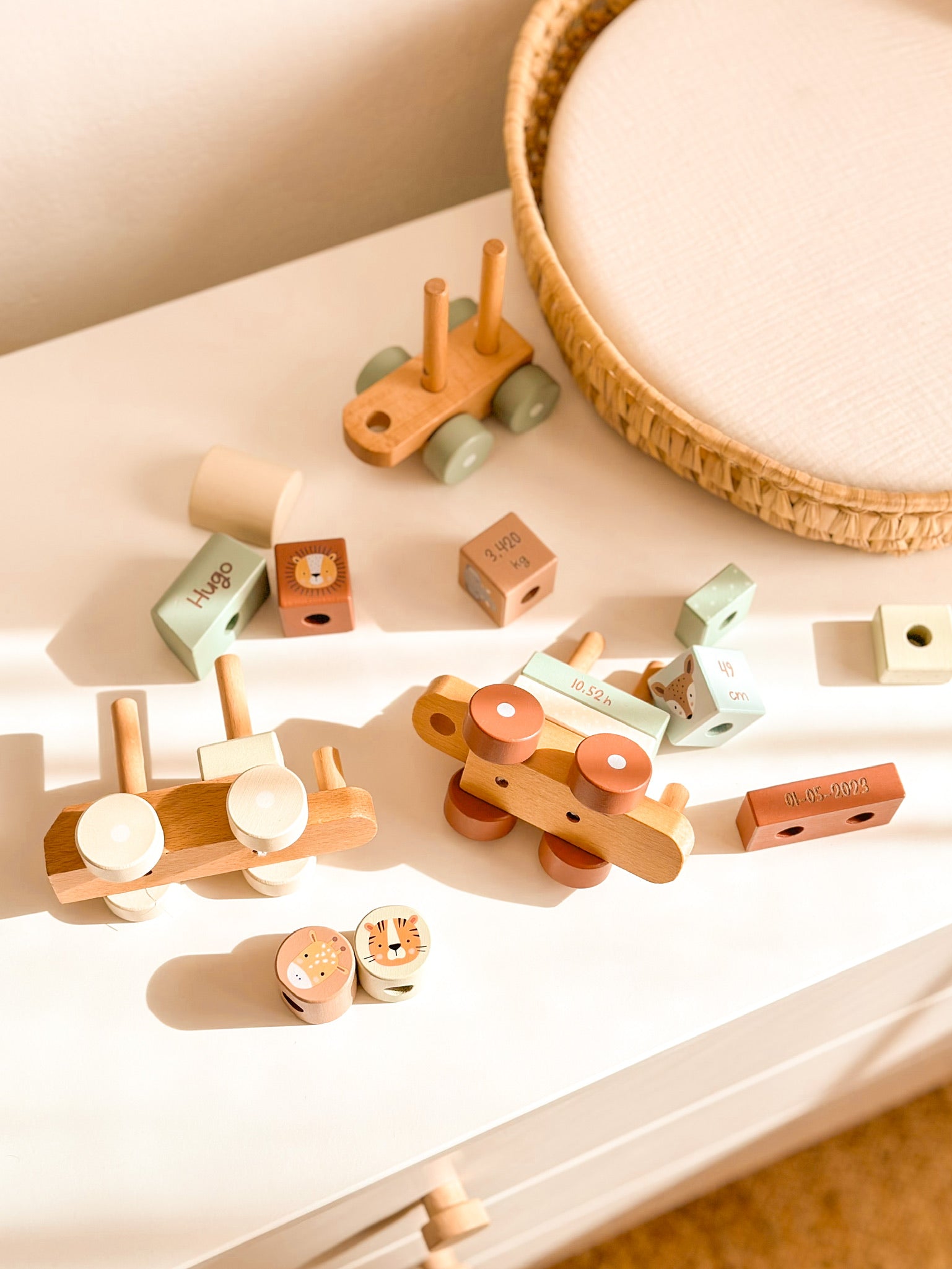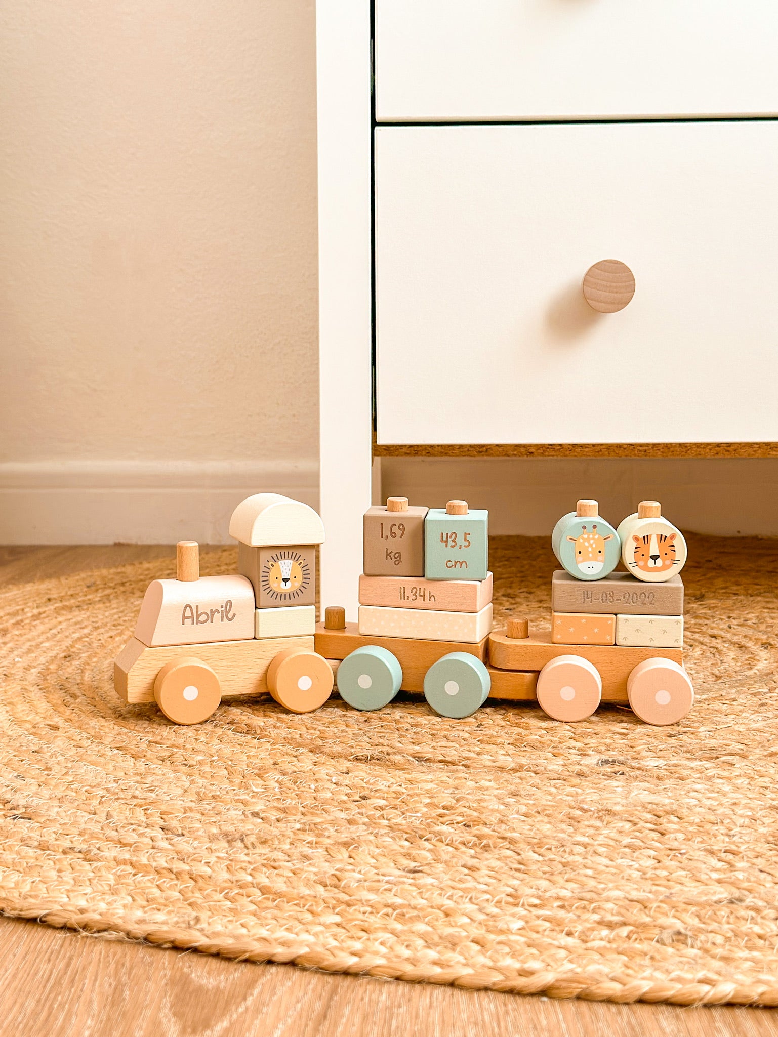 Tren con bloques apilables de varias formas y colores de la marca Monnëka que permite a los niños crear sus propios vagones. Compuesto por 1 locomotora, 2 vagones y 13 bloques apilables en colores suaves.