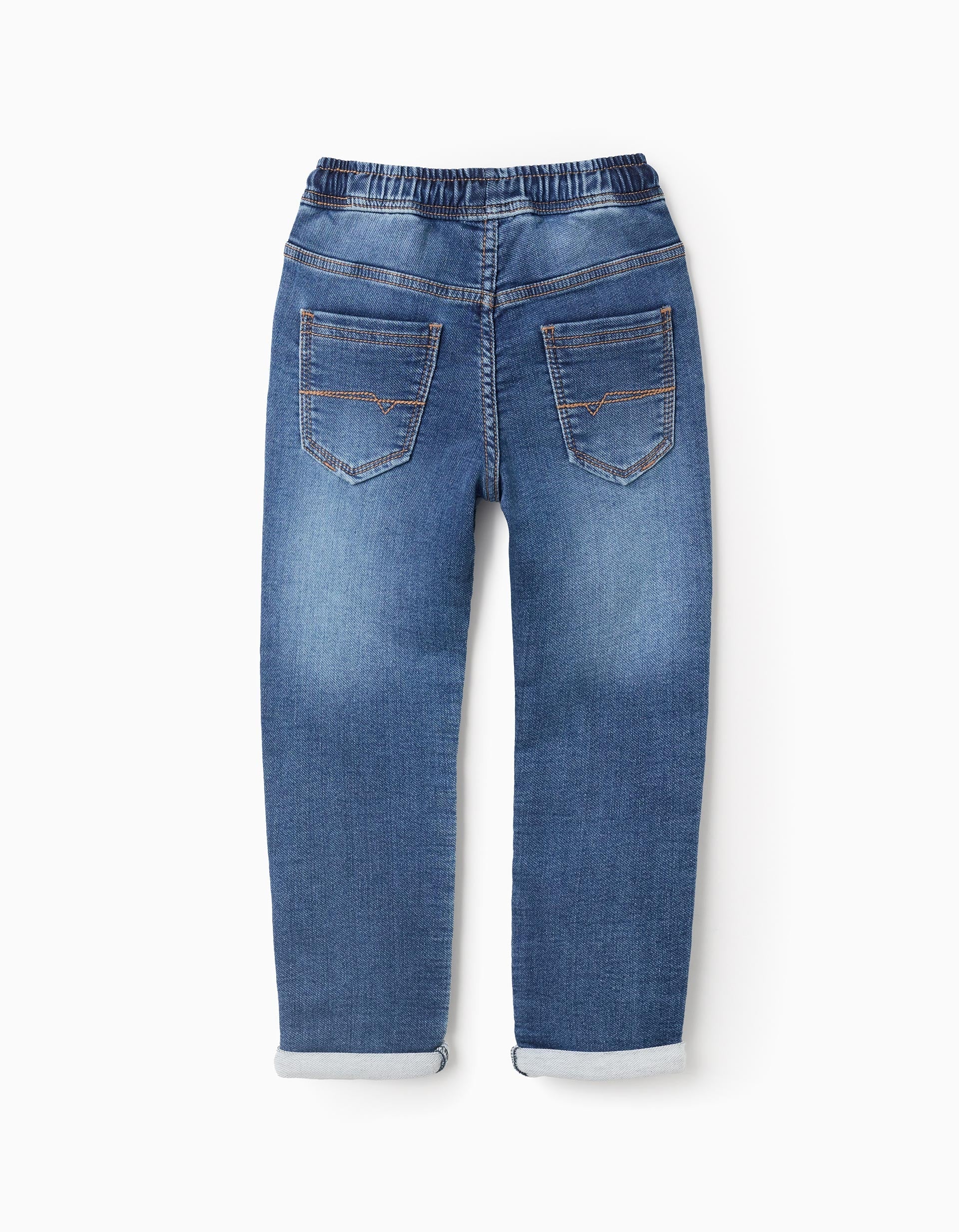 Vaqueros azules para niño, estilo joggers slim. Confeccionados en tejido vaquero de mezcla de algodón con un toque de elástico para mayor comodidad y libertad de movimientos. Cintura elástica, ajustable en el interior y con cordón de ajuste a contraste en el exterior. Cinco bolsillos. Dobladillos plegables. La versatilidad de unos vaqueros con la comodidad de unos pantalones de chándal en una sola pieza.