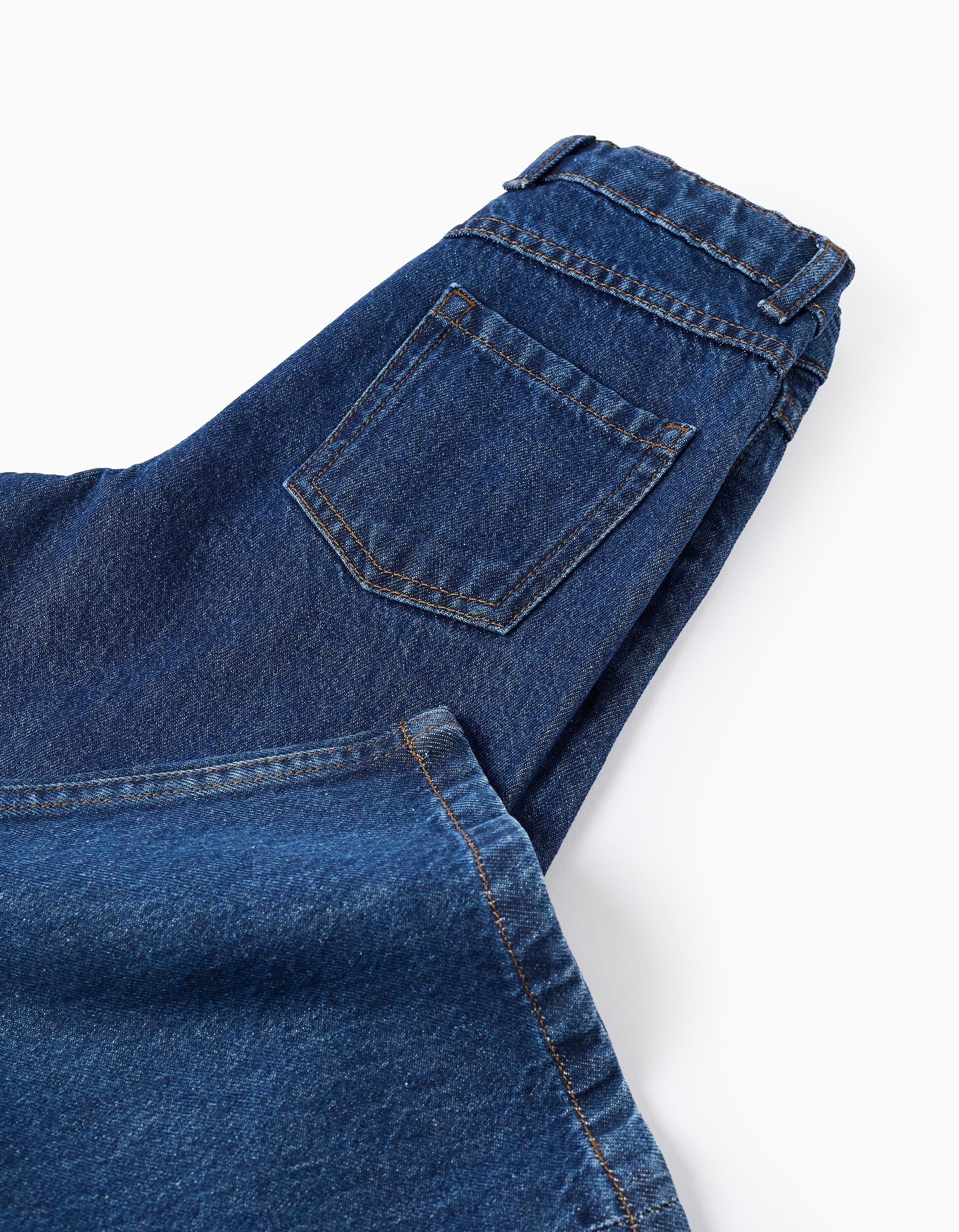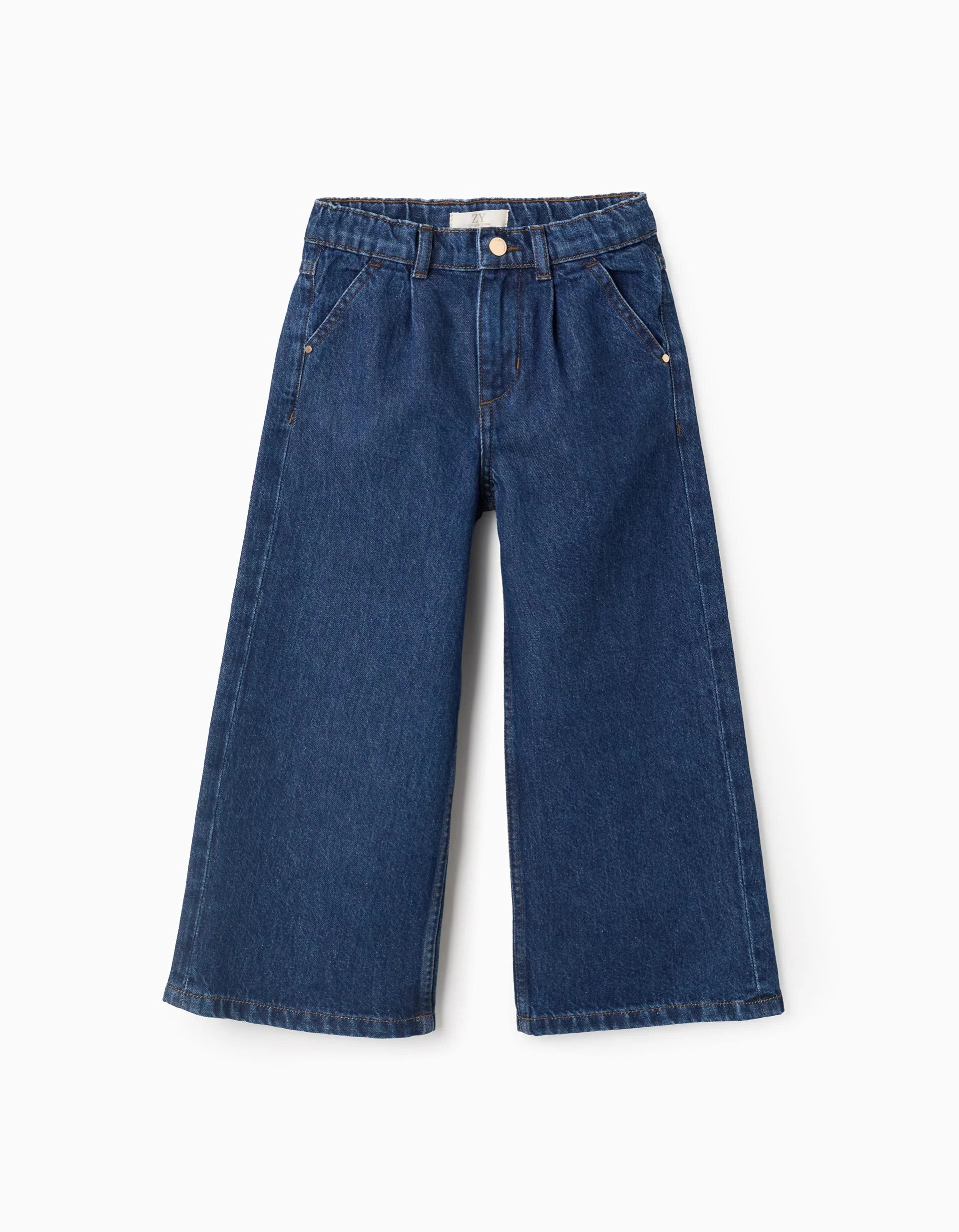 Vaqueros azul oscuro para niña, modelo de pernera ancha. 100 % algodón. Cuatro bolsillos. Cintura interior ajustable con elásticos y botones. Big Me: se abrocha con un botón a presión bajo un botón decorativo hasta la talla 8/9, para facilitar el vestido y favorecer la autonomía de tu hija.