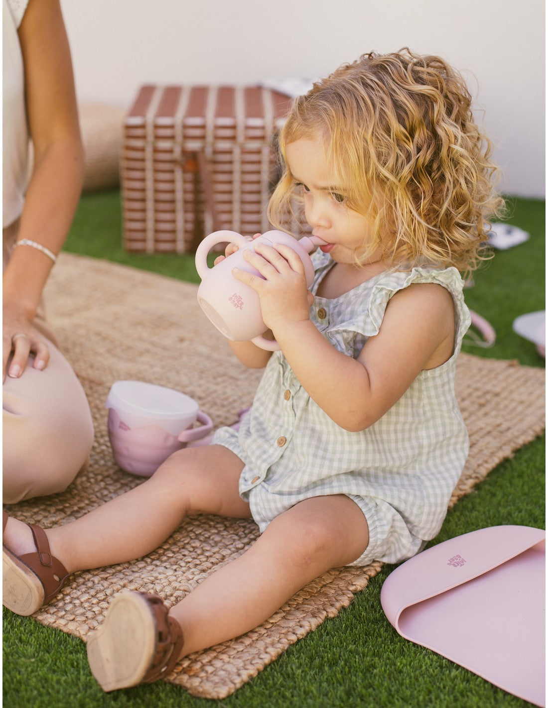 Es un vaso de aprendizaje antigoteo con pajitafabricadoen silicona para bebés,e evita que el bebé derrame el contenido.