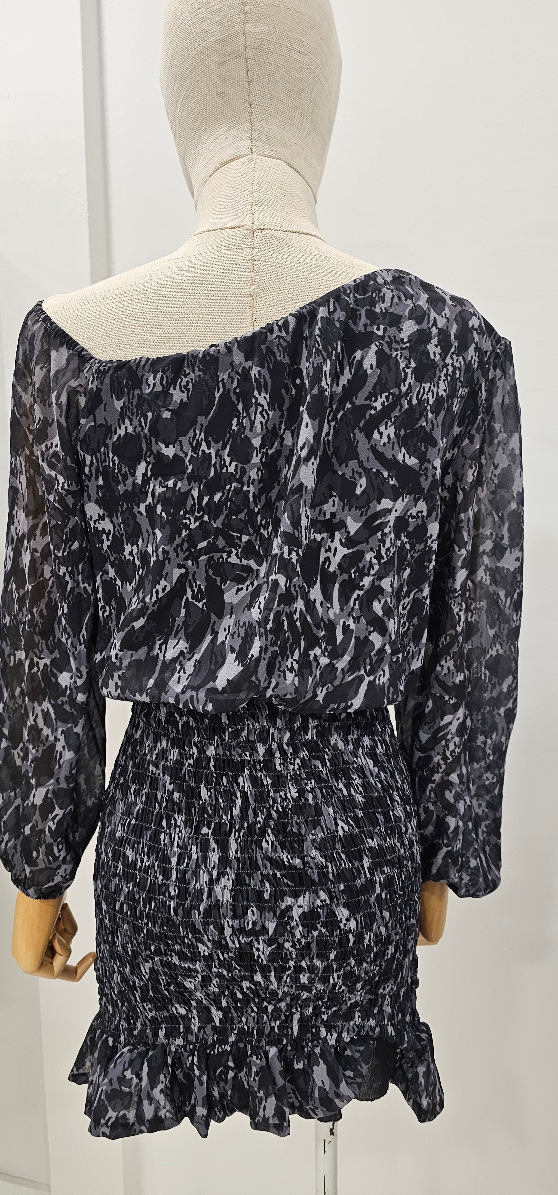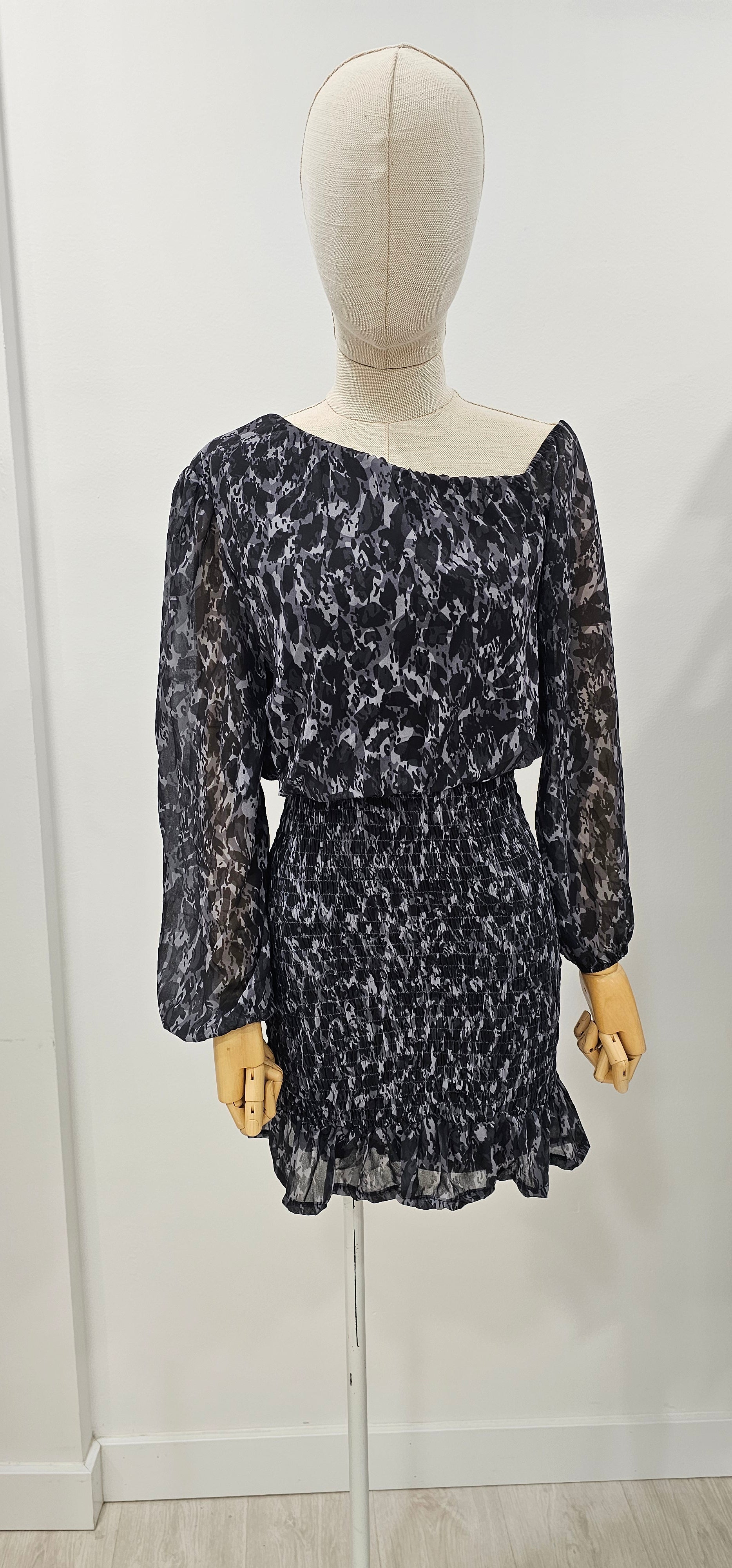 Talla única que se adapta a XS, S y M. La falda está confeccionada en un tejido elástico y engomado, mientras que la parte superior presenta mangas semitransparentes de gasa y el cuerpo está forrado. Destaca su escote asimétrico y viene acompañada de un lazo hecho con el mismo material.