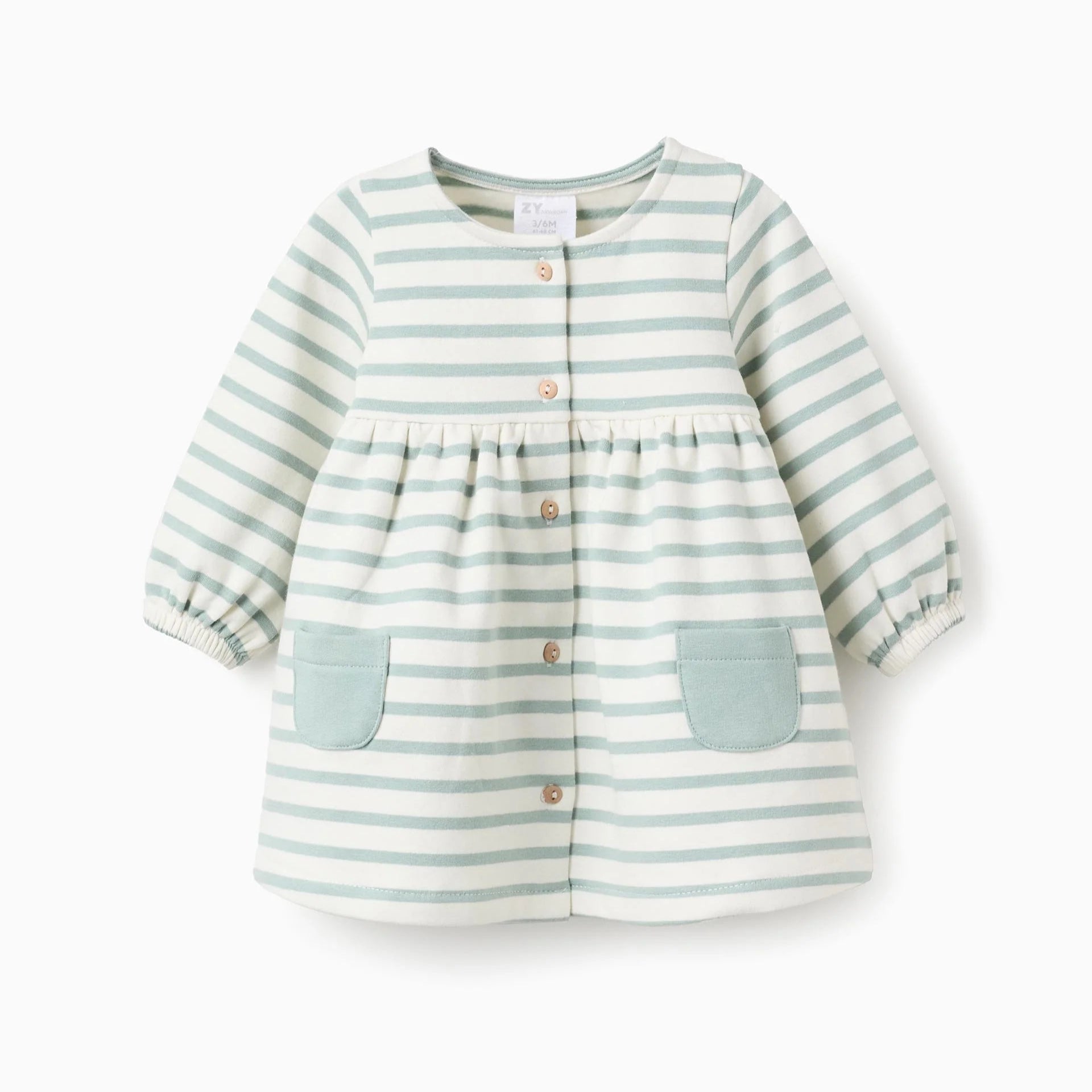Vestido a rayas blancas y verde agua para recién nacida, con interior perchado para mayor confort térmico. Con fruncido, botones y bolsillos en contraste. ¡Una opción adorable y confortable!