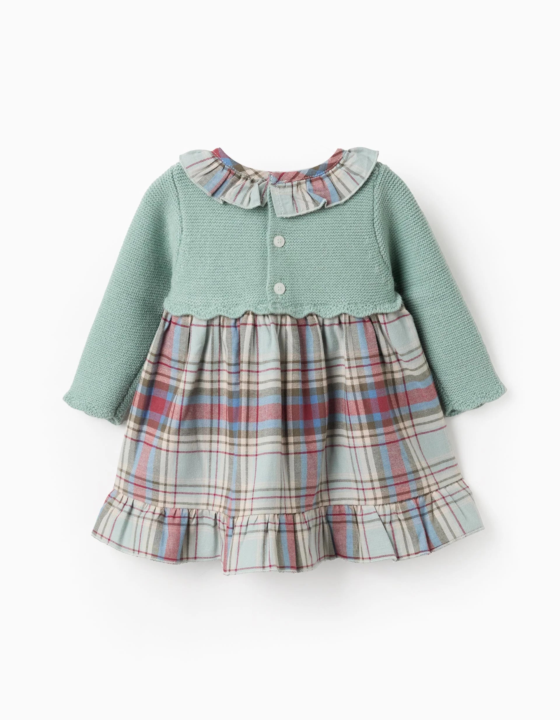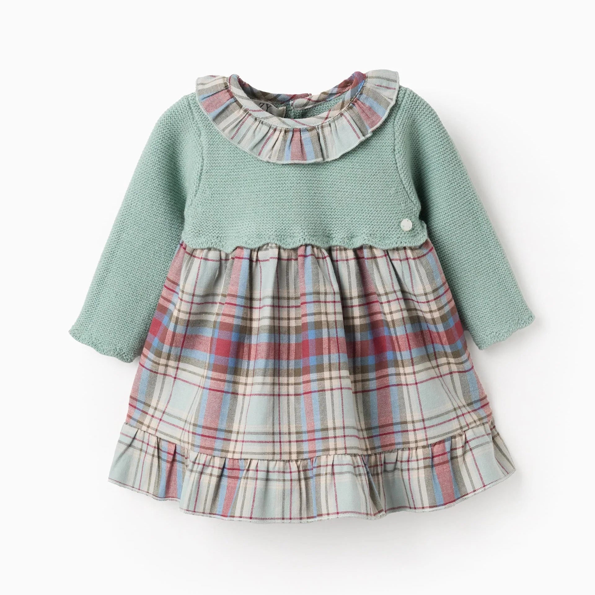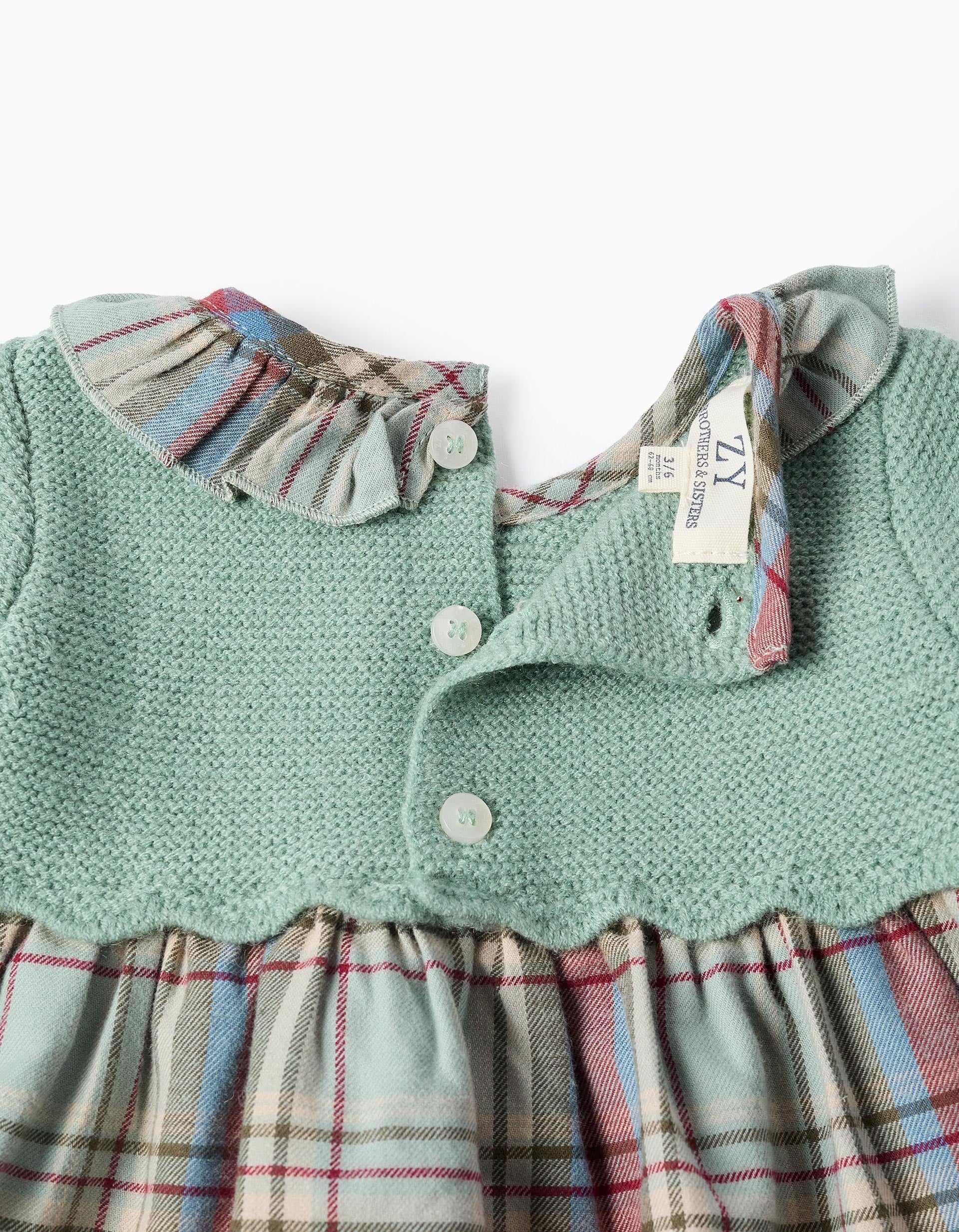 Colección Brothers & Sisters. Vestido combinado para recién nacida. Parte superior de punto verde, suave y acogedor. Cuello y parte inferior en tejido 100% algodón con cuadros en tonos de verde, rojo y azul. Con volantes. Se cierra por detrás con botones para que sea fácil de poner. Un cuadro original para usar en familia.