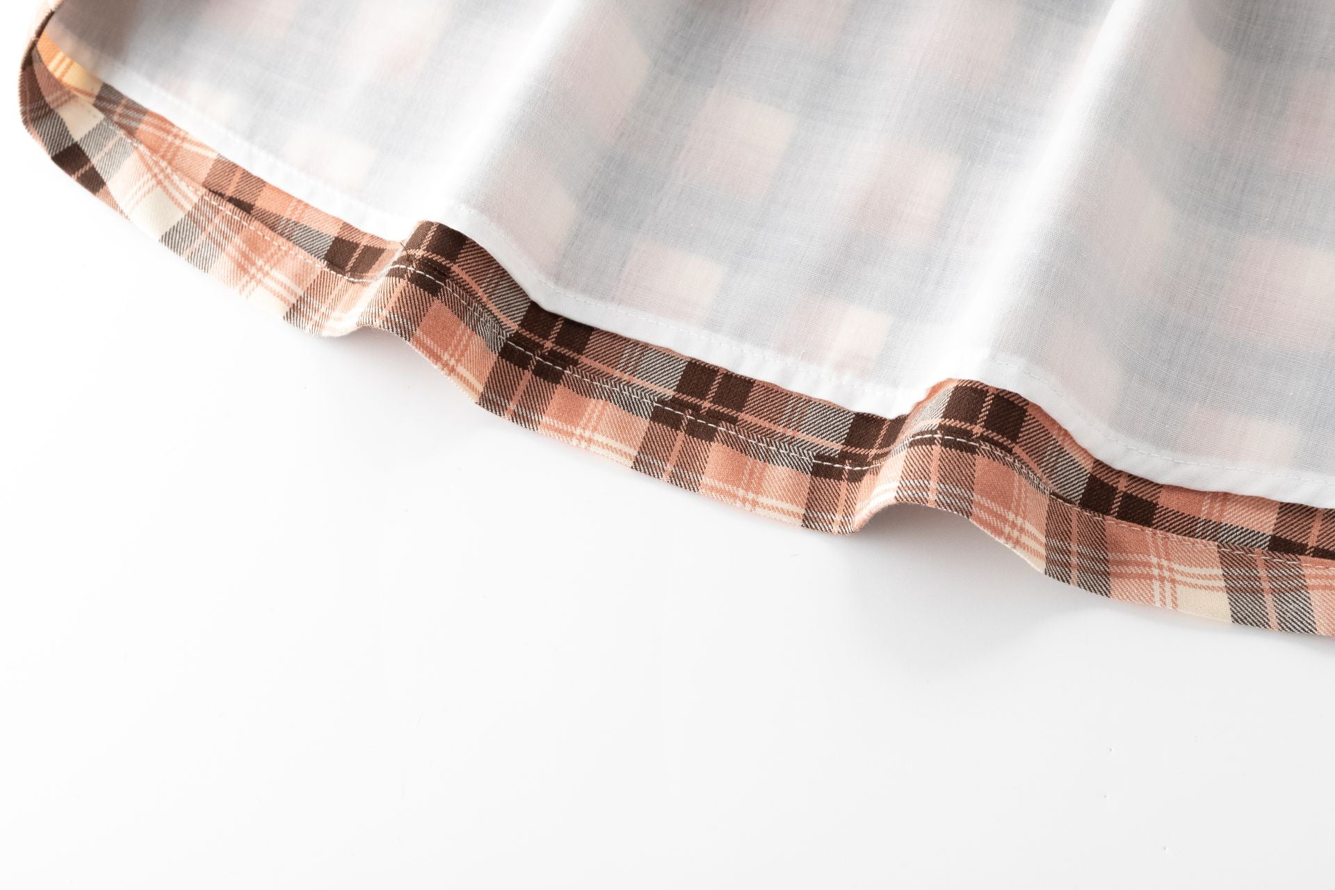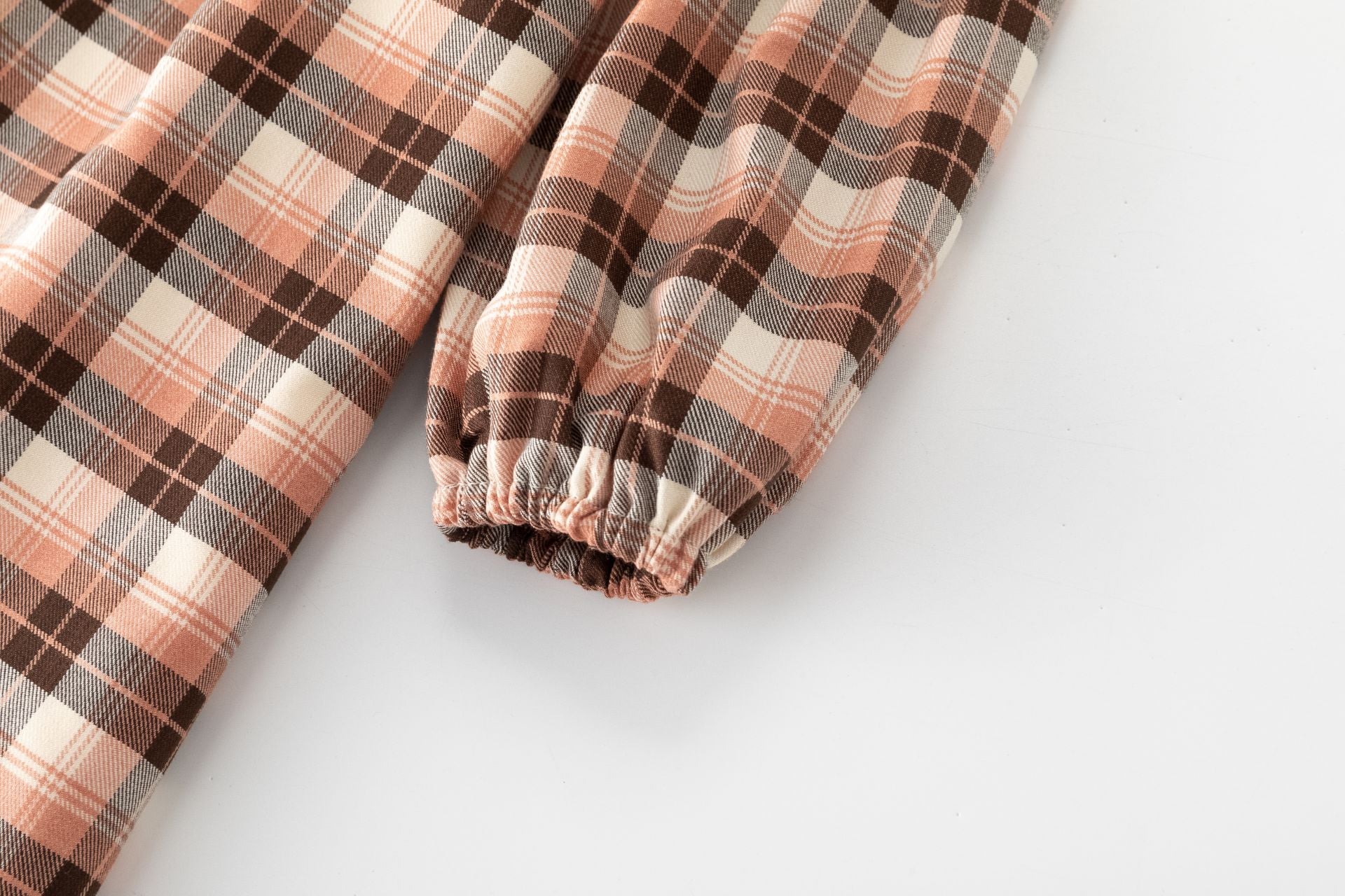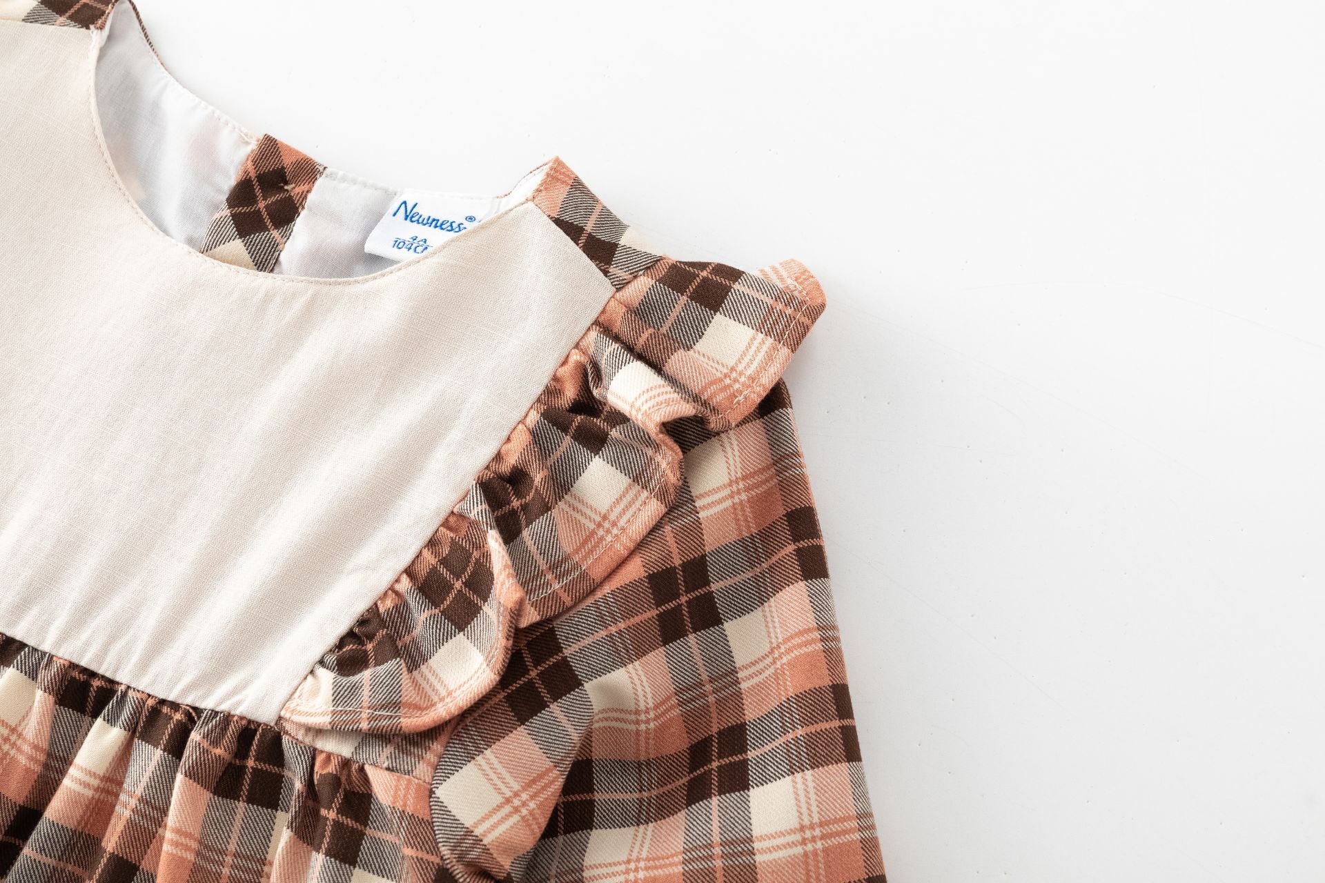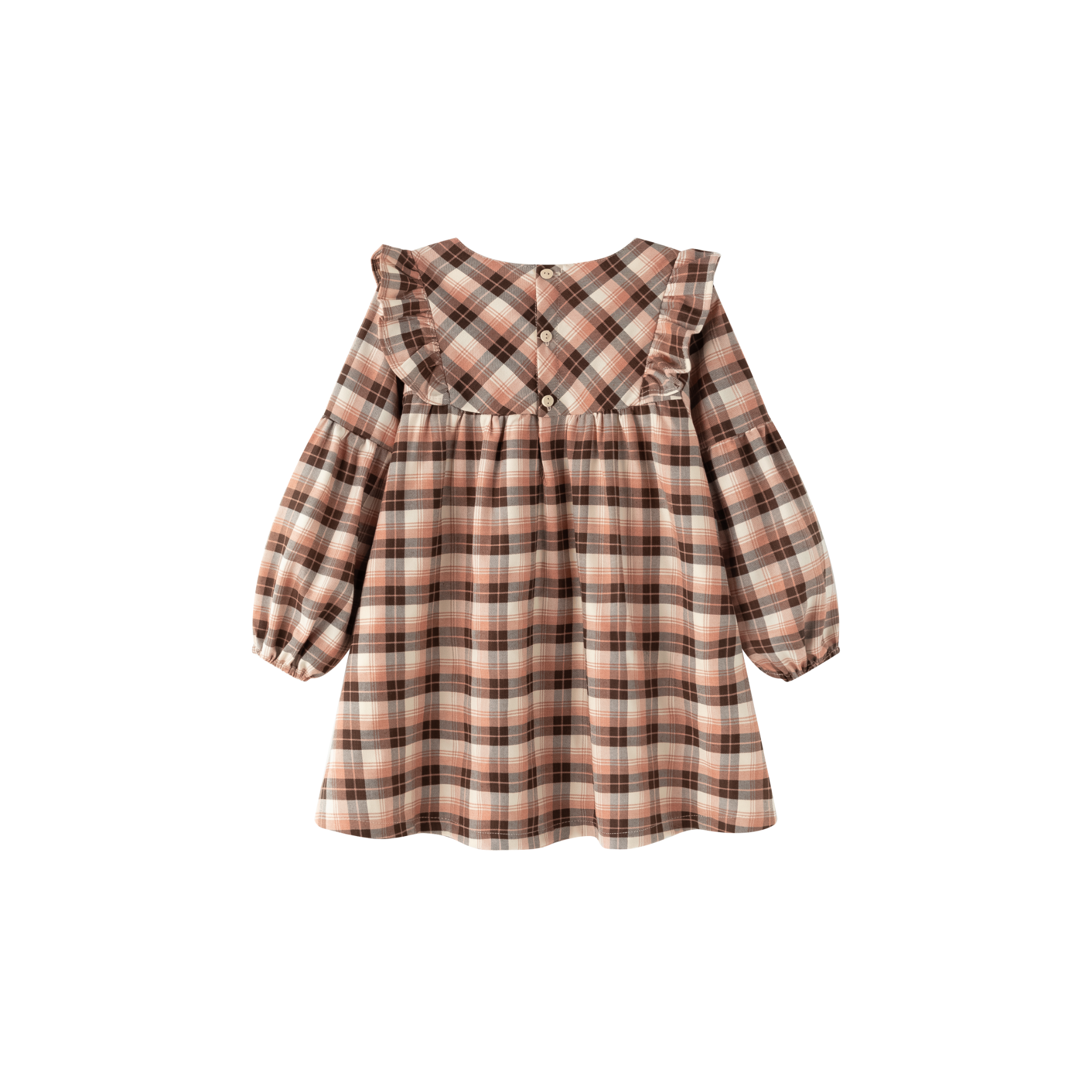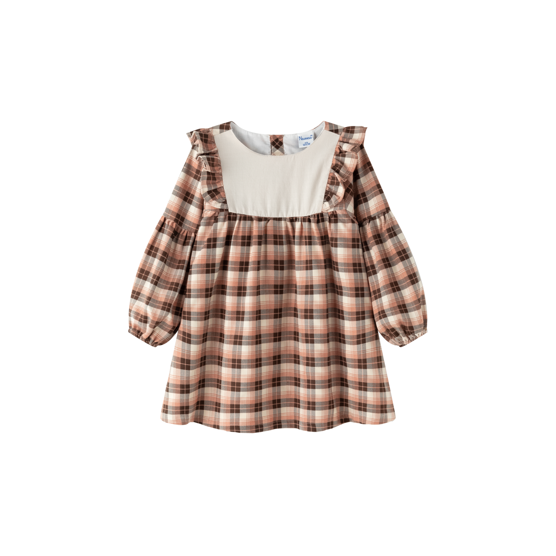 Vestido de manga larga con volantes delante, cierre trasero con botón.